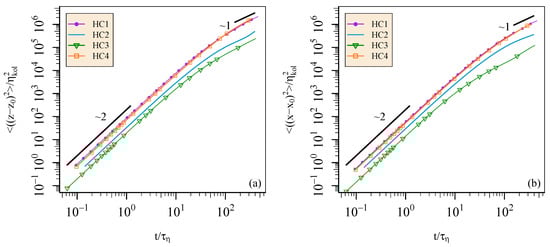 Lagrangian single-particle diffusion curves in the direction (a) parallel to gravity, and (b) perpendicular to gravity for simulations HC1, HC2, HC3, and HC4. Time is given in units of the Kolmogorov time-scale .