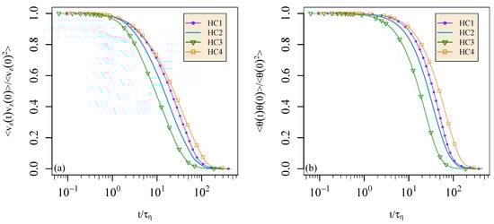 Lagrangian autocorrelation function of (a) the velocity aligned with gravity , and (b) the thermal fluctuations . In (b) a dotted grey line is provided in the background as a reference for the autocorrelation function of in the simulation HC2. Time is given in units of the Kolmogorov time-scale . Triangular brackets indicate an average over Lagrangian particles.