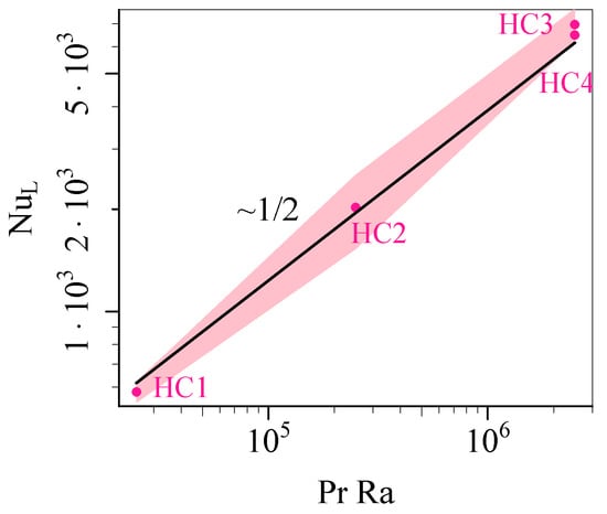 The scaling of the Nusselt number with the product of Prandtl and Rayleigh numbers. The shaded region indicates one standard deviation of the instantaneous Nusselt number above and below the time-averaged value.