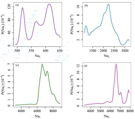 One reason for the inaccuracies in this scaling stems from the use of an average Nusselt number. We find that the instantaneous Nusselt number can change rapidly and vary over a wide range during a simulation of steady state convection, so that neither the average Nusselt number nor its standard deviation characterizes the heat transfer particularly well. Other works have found a similar large time-variation in the Nusselt number, for example see Figure 1 of Schmalzl et al. [28]. To quantify this variation, we examine the probability density functions (PDFs) of the instantaneous Nusselt number from Equation (7) (see Figure 6). In this figure, the PDFs are all multi-modal; two of the four PDFs also feature a heavy tail. To some extent, this may be attributed to the fact that, in our homogeneous system intended to model convection in natural settings, local temperature gradients can become more significant than the imposed and L. Local temperature gradients can also change in time with the changing structure of the flow.
