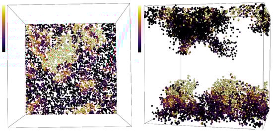 Visualization of particles in a slice of the simulation volume determined by the first three grid spaces in the z-direction in simulation HC1: two-dimensional visualization at the initial time point (left), and three dimensional visualization as the same particles trace the evolution of the evolving convective flow structures (right). Particles are colored by the instantaneous local Nusselt number that they experience between zero and , with dark colors indicating a low Nusselt number and bright colors indicating a high Nusselt number.