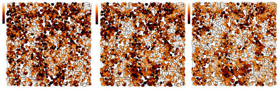 Visualizations of the Lagrangian vertical heat structure in the same slice of the simulation volume shown in Figure 7, in simulation HC1 () for temperature separations (left), (middle), and (right). Darker color indicates a lower value of .