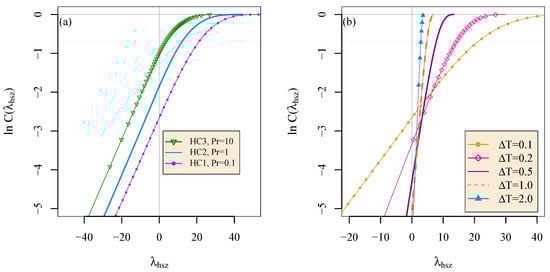 As larger differences in temperature are considered, the mean value of appears to approach an asymptotic value that is similar between these simulations. The ordering of the means for different Prandtl numbers agrees with the result of Schmalzl et al. [28] for each . At , the ratio of the mean between HC1 and HC3 is 1.86; between HC2 and HC3 it is 1.27. For these three simulations, for moderately small , the mean Lagrangian vertical heat structure gains a progressively sharper and higher peak as the Prandtl number is decreased. In addition, a comparison between simulations HC2 and HC4 reveals that as the Rayleigh number is increased for fixed Prandtl number, this peak becomes sharper and higher. A comparison between simulations HC1 and HC4 shows that for fixed Grashof number and increasing Prandtl number, the peak becomes less sharp and lower. The results of Figure 11a imply that dynamo simulations that are produced using may represent a transfer of heat that is characteristically similar to the lower Prandtl number settings that they represent, and more accurate for larger heat changes. The standard deviation of is shown in Figure 11b. Surprisingly, unlike the mean, the standard deviation of is nearly identical for all simulations, despite the different Prandtl numbers. The data indicate that this standard deviation decreases approximately as the inverse of the temperature separation.