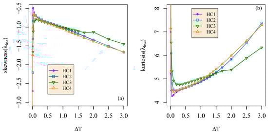 Skewness (a) and kurtosis (b) of vs. temperature separation for simulations HC1, HC2, HC3, and HC4.
