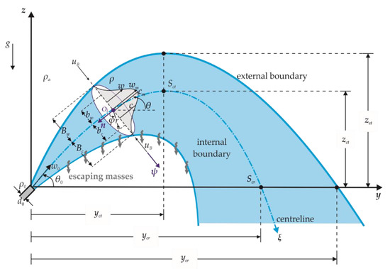 where wB and cB are the vertical velocity and concentration of escaping masses; uB is the entrainment velocity of the inclined buoyant jet at the actual boundary Bw = d0/2 + nw bw and nw = 2−1/2 [7,8]).