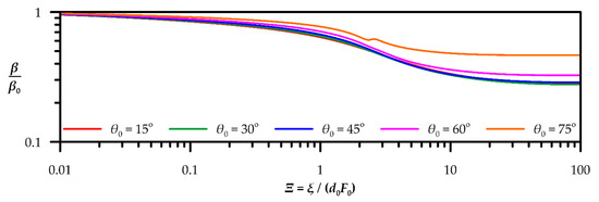 Variation of the normalized buoyancy flux β/β0 with dimensionless distance Ξ = ξ/(d0F0) and initial inclination θ0.