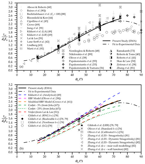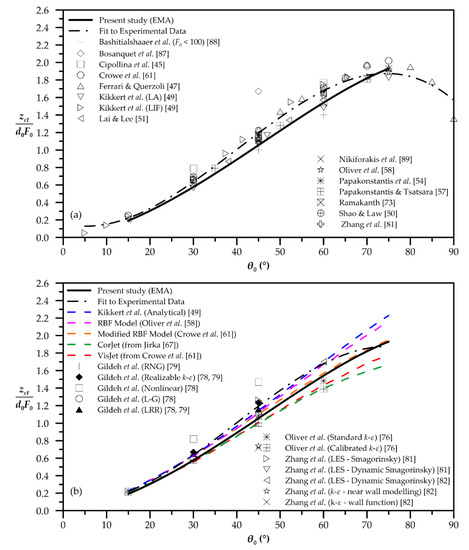 Figure 4 shows the variation of dimensionless centerline terminal rise height zct to the initial inclination angle. EMA’s prediction is compared to available experimental data. The terminal rise height EMA passes through the scatter of experimental data following their trend. The latter is more obvious if a polynomial fit to experimental data [45,47,49,50,51,54,57,58,59,61,73,81,87,88] is made. For this purpose, a third degree polynomial is fitted to experimental data using the least square method. The equation of the polynomial is presented in Table 1. In the range 15° ≤ θ0 ≤ 75° EMA’s prediction is very close to the polynomial fit. It must be noted that EMA predicts the centerline as the midpoint of the round cross-section. The same procedure is followed by Bosanquet et al. [87] and Bashitialshaaer et al. [88]. Instead, Cipollina et al. [45], Kikkert et al. [49], Ferrari and Querzoli [47], Shao and Law [50], Lai and Lee [51], Oliver et al. [58], Nikiforakis et al. [89], Crowe et al. [61], Ramakanth [73], and Zhang et al. [81] determine the position of centerline as the point where the transverse profile of velocity or concentration is maximized. In particular, this point is shifted towards the external edge, moving away from the midpoint of cross-section. As the initial inclination angle is rising, the deviation of actual transverse profile is deviates intensively from the Gaussian presenting this difference, while, when the initial inclination reaches the vertical, this deviation is reduced, and EMA’s prediction coincides with the experimental data. Thus, the deviation between EMA’s prediction and the experimental data in the range 20° < θ0 < 70° is reasonably expected. In Figure 4b, EMA’s prediction of centerline terminal rise height is compared to other models results. For θ0 < 30° all models almost coincide. For θ0 > 30°, Kikkert’s analytical solution and the RBF model are diverging upwards calculating higher values than EMA’s and modified RBF’s predictions that approximately coincide up to 75°. The commercial packages CorJet and VisJet are underestimating the centerline terminal rise height for θ0 > 30°. In Figure 4b, the results of CFD analysis from Gildeh et al. [78,79] Oliver et al. [76] and Zhang et al. [81,82] for a variety of simulations are included. CFD’s results are for the most usual initial inclination angles of 15°, 30°, 45° and 60°. For 15°, all CFD’s results coincide, showing that the option of RANS or the most sophisticated LES approach does not have major effect on the results. There are significant differences among CFD simulations for θ0 = 30°, 45° and 60°, where the scatter of the results is maximized for θ0 = 45°. In any case, EMA predictions are within experimental data.