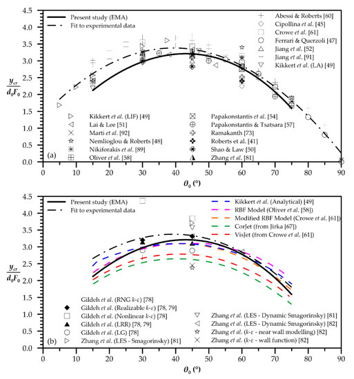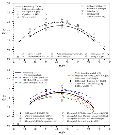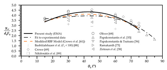 The prediction of the dimensionless horizontal location of the return point of jet axis to initial level, ycr, is shown in Figure 7. EMA’s results are compared to several experimental data for various initial inclinations in Figure 7a. Comparing EMA’s prediction to experimental fit line [41,45,47,48,49,50,51,52,54,57,58,60,61,73,81,89,91,92] (Table 1), it is obvious that EMA follows the fit line, underestimating the return point location in the whole range of 15° ≤ θ0 ≤ 75°. The difference is maximized for θ0 = 15°, decreases approaching approximately θ0 = 60° and slightly increases at θ0 = 75°. Comparing to other models and CFD predictions (Figure 7b), the EMA’s predictions seem to be better and rather satisfactory. Additionally, the corresponding variation of the external edge to initial inclination angle is presented in Figure 8. EMA’s predictions are compared to the experimental data of Bashitialshaaer et al. [88], Crowe [69], Nikiforakis et al. [89], Oliver [68], Papakonstantis et al. [53], Papakonstatis and Tsatsara [56], Ramakanth [73] and Zeitoun et al. [38], and the modified RBF Model [61]. Again, a third-degree polynomial is fitted to experimental data [38,53,56,68,69,73,88,89] (Table 1). The two models predict quite similar values. The divergence of the EMA model to the experimental fit line is less than 10% for initial angles in the range 15° ≤ θ0 ≤ 75°.