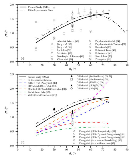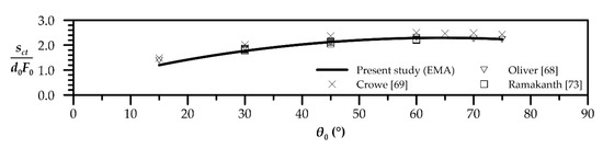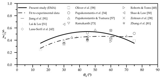 Figure 9 presents the prediction of the EMA model for axial dilutions at the centerline terminal height (Sct). The prediction is compared to available experimental data. EMA’s dilution values are overestimated, compared to a third degree polynomial fit [38,40,42,50,51,54,57,58,73,81,91] (Table 1) to experimental data, in the range of initial inclination angles 15° ≤ θ0 ≤ 65°. In the range 65° < θ0 ≤ 75°, the maximum underestimation is 24.0%, which occurred for θ0 = 75°.