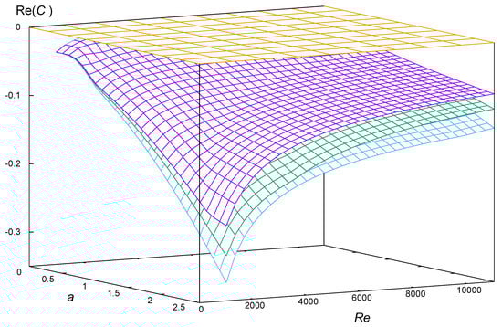 Real part of the time decay coefficient, , when a runs from 0 to , and the Reynolds number is in the interval . The meshed plane corresponds to , the surfaces corresponds to the set of points , for sample Bingham values (purple), (green) and, (cyan).