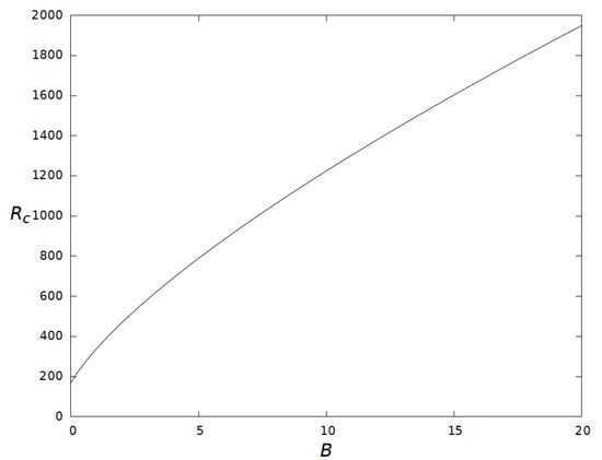 In Figure 3 we have plotted the critical Orr-Reynolds number as a function of the Bingham number. The graphic shows the stabilizing effect of yield stress (Bingham). We note that in the limiting case as we obtain the critical value for the Newtonian fluid (note that here the depth of the layer is D while in [2] it is , therefore in the limiting case we obtain a critical value which is twice the size of the corresponding critical value of the Orr–Reynolds number obtained with the same boundary conditions).