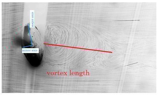 In this paper we are concerned with highlighting the dynamics of vortex formation, specifically through an examination of the vortex length in a flow past an elliptical obstacle. Experimental measurements of the length and width of wake vortices past cylinders have been discussed in the literature [14,16,18,19,20,21,22,23,24]. The vortex length, usually denoted , is defined as “the streamwise distance between the confluence point (wake stagnation point) and the rear stagnation point of the cylinder” [17]. It is also, more commonly, defined as the distance between the rear stagnation point and the “point downstream where the velocity fluctuation level has grown to a maximum” [14] (Figure 1 provides a schematic explanation of this metric). Experiments and numerics indicate the relation between and maximum velocity fluctuation and the base pressure (at the rear of the obstacle) to be inversely proportional [23,25,26]. Coutanceau and Bouard [27] put forth the linear equation for , which, in the steady, symmetric vortex regime, related the growth of the near wake vortex as a function of .