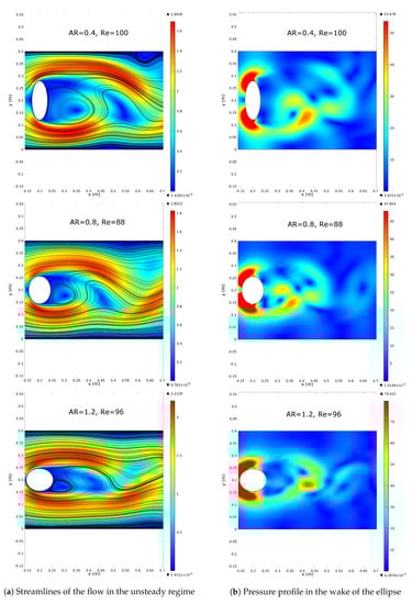 Here, is the density of the fluid, u = is the divergence free flow field, t is time, is the kinematic viscosity, and p is the pressure. The Reynolds number is defined as , where U is the far-field of free-stream velocity, ranging between 0.1–1 m/s, d is the characteristic length, which in this case was m and is the dynamic viscosity, taken to be kg/m3. The solution to the above flow equation yielded the velocity and pressure fields which were then utilized to identify the vortex length for and ellipses of varying aspect ratios ( is the ratio of minor axis to major axis). The major and minor axes of the ellipses were chosen to conform to the desired values of but with keeping the area of each ellipse the same as that of the cylinder. Table 1 summarizes the important parameters used in the numerical computations.