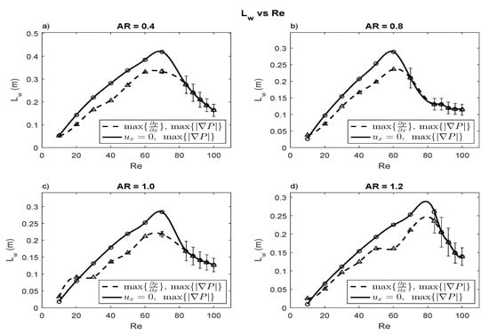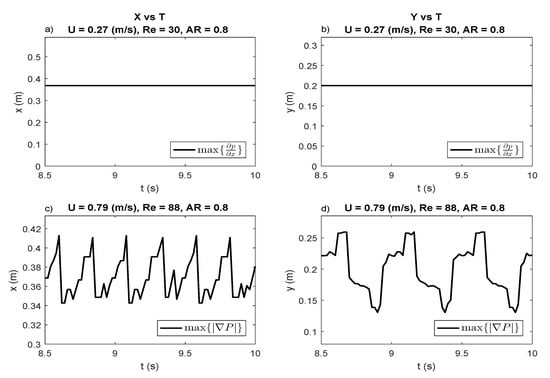 In the case when flow becomes unsteady, the wake region oscillates in space and time (see the bottom panels in Figure 4). The vortex region is asymmetric about and moves in both spatial directions x and y. In this case the critical point at a given time was defined by the maximum of the magnitude of the pressure gradient, , which is a generalization of the criterion used in the steady state case and the appropriate length is the time averaged vortex length over a period. We use numerical interpolation to smooth the data and find our zeros and extremum.