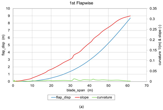 where blade span is the span location of a point on the blade reference axis measured with respect to blade root, flap disp is the blade displacement out of the rotor plane obtained from BModes, slope is the first derivative of the flap displacement with respect to the blade span, and curvature is the second derivative of the flap displacement with respect to the blade span.