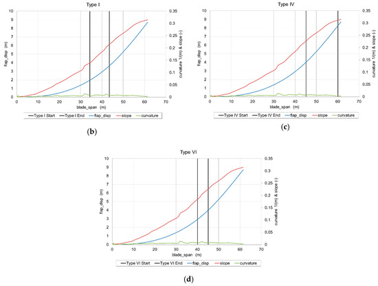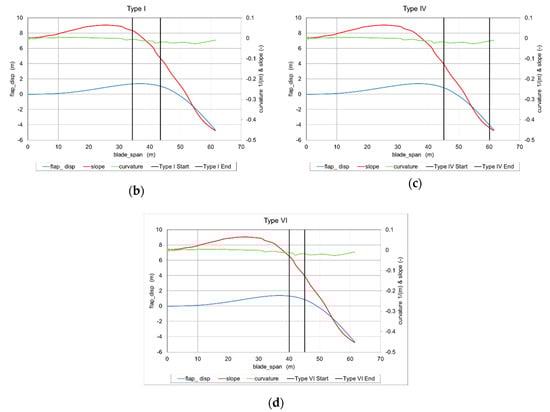 (a) Flap deflection, slope, and curvature of the second eigenmode of the considered WT blade, (b) location of tip accumulator of type I, (c) location of tip accumulators of type IV, and (d) location of tip accumulators of type VI.