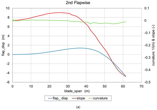 A rotor blade can be bent in edgewise direction and in flapwise direction. In flapwise direction, it is much more flexible than in edgewise direction; hence, it can bend a lot more in flapwise direction. Since a rotor blade can be considered a beam, it can vibrate with different eigenfrequencies, i.e., it has different eigenmodes. Vibration with a particular eigenfrequency leads to deformations of the blade with the respective mode shape. Due to the fact that the first and the second eigenmodes lead to the largest deflections of rotor blades, this study focusses on the first and the second eigenmodes in flapwise direction only. In order to compute the eigenmodes of a beam, like the Sandia 61.5 m rotor blade [7], a finite-element method (FEM) program is needed that provides the coupled modes of the WT blade. Such a program is also provided by NREL and is called BModes [8]. BModes applies the Euler Bernoulli beam theory combined with Hamilton’s principle and is capable of computing the coupled modes of beams in general; hence, it can be used for both the blades and the tower of a WT. All the specifications that BModes needs, like rotor speed, blade geometry, and pitch control, can be derived from the specification of the NREL 5 MW WT [4]. BModes also requires structural property distributions along the rotor blade. These properties are derived from the Sandia 61.5 m rotor blade design [7]. With the aforementioned information, an input file for BModes is prepared, in order to compute mode shapes and frequencies. BModes uses FEM followed by an eigen analysis to compute the eigenmodes [8]. As a result, BModes generates an output file, where the computed coupled mode shapes are shown as spanwise distribution of flap, edgewise, twist, and axial displacement components in a particular mode. Flap displacement is the displacement that the blade exhibits out of the rotor plane, relative to its rest position, when a pitch angle of zero degrees is considered [8]. This component is used to illustrate the nodal displacement for the first and the second eigenmodes in Figure 2 and Figure 3, respectively. Based on this component, slope and curvature of modal displacement curve can be derived as follows, and shown in Figure 2 and Figure 3.