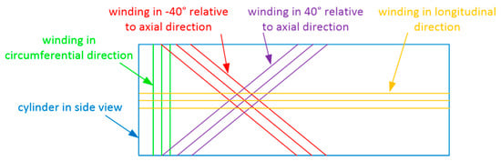 - Windings in a certain angle (positive and negative), with respect to the longitudinal axis, add to stiffness in the radial direction and in the axial direction, to an extent that depends on the angle. Most importantly, these windings add to the torsional stiffness of the cylinder (the angles shown in Figure 7 are only arbitrary examples for illustration).