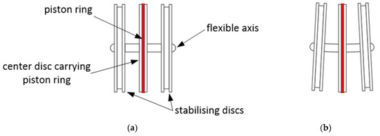 The outer discs (called stabilising discs in Figure 8) prevent the piston from tilting. The centre disc carries the piston ring, and therefore, separates the gas chamber from the fluid chamber. The three discs are connected to each other via a flexible rod, which can be bent easily when the cylinder around the piston gets bent.