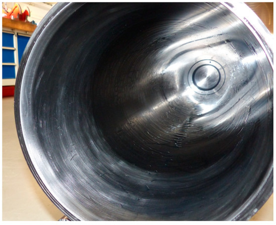 Based on the information about the bending behaviour of the Sandia 61.5 m rotor blade presented in Section 2, HYDAC, in cooperation with PRONEXOS, built a prototype of a CFRP piston accumulator with a steel liner on the inner surface of the CFRP tube, see Figure 9. Figure 9 shows the steel liner covered with the CFRP laminate. In the background, the piston can also be seen. This prototype is tested in the test area of HYDAC Technology. Further design specifications for the prototype are: