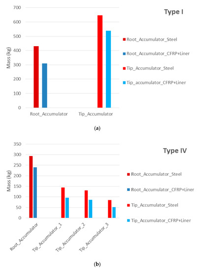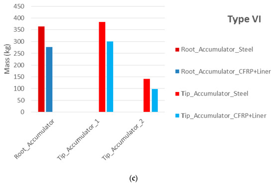 Mass comparison of blade tip and blade root accumulators from steel and from CFRP with steel liner for (a) type I, (b) type IV, and (c) type VI.