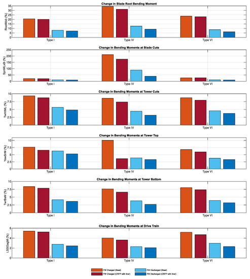 At first, the change in ultimate loads of the blades, the drive train, and the tower of the 5 MW WT due to both designs of the FW system are discussed. Figure 11 depicts the change in ultimate loads as a percent increase in bending moments. The charged and the discharged states of the FW system with CFRP accumulators are represented in Figure 11 in dark red and dark blue, whereas the charged and discharged states of the FW system with conventional steel accumulators are shown in light red and light blue, respectively. The increase in bending moments when both FW designs are in a charged state are obviously greater than the bending moments when the FWs are in a discharged state. The reason for this is that the fluid mass in the charged state is added to the stationary mass of the tip accumulator, where the lever arm of the gravitation force has a larger distance to the centre of rotation. Also, the larger distance to the centre of rotation leads to larger centrifugal forces created by the fluid mass. Due to the stationary weight reduction of the CFRP accumulator, the increase in bending moments of almost all FW types is lower for the CFRP design compared to the conventional steel design. Excepted from this is the change in bending moment at blade cuts for FW Type IV in the charged state. Only in this scenario is the increase in bending moment of the CFRP design about 2% greater than the conventional steel design. The reason for this minor increase is the difference in WT operating points of both FW designs when the maximum turbulent wind speed hits the rotor blade.