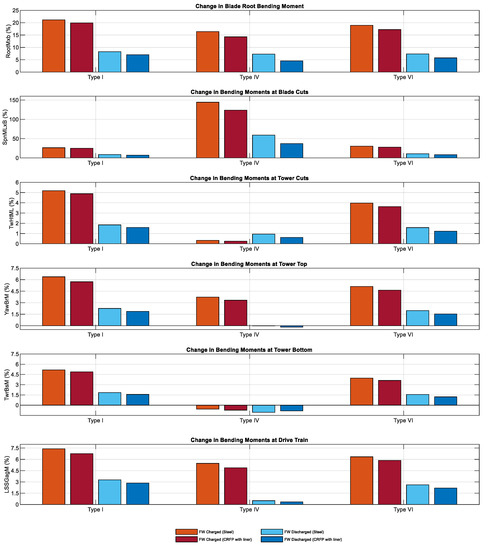 Figure 12 compares the change in fatigue loads for both FW designs at the rotor blade, the tower, and the drive train of the 5 MW WT. The light red and the light blue bars in Figure 12 represent the charged and the discharged states of the conventional design of the FW system, respectively. The columns in dark red and in dark blue represent the charged and the discharged states of the CFRP design of the FW system, respectively.