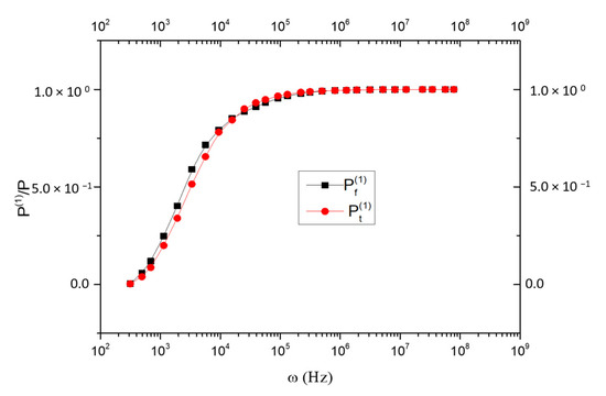 Comparison between normal (black line) and cancerous cells (red line) orientation polarization P(1) values as a function of frequency, see equation (A23).