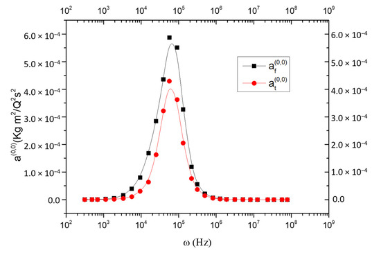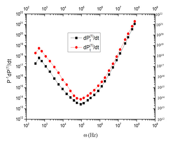 It could be argued that < should result in < . However, an important role is played by the (a(00) − a(11)) terms as can be seen from Figure 6. In fact, P(1) is related only to polarization by orientation (according to Debye’s scheme), but a(00) and a(11) are linked to intrinsic characteristics of the medium related to other phenomena. From Figure 7, which shows the trend of entropy production, it is possible to observe that healthy cells have greater entropy than cancerous ones. This means that cancer is a more orderly system than a physiological one, as already found in other pathologies. However, the temporal evolution of tumor pathogenesis is not the object of this study, because the results reported here are derived only from the measurements reported in reference [7]. These results, obtained by processing the experimental data of Wang et al. (2014), allowed us to achieve a new characterization of lung cancer by highlighting several peculiarities of cancer at the time of the dielectric measurement [7]. The obtained curves will be now analyzed as a function of frequency. In the frequency range considered, two sectors are identified in which the trend of the curve is oppositional. The frequency separating the two sections is about ω = 105 Hz (see Figure 1 and Figure 6).