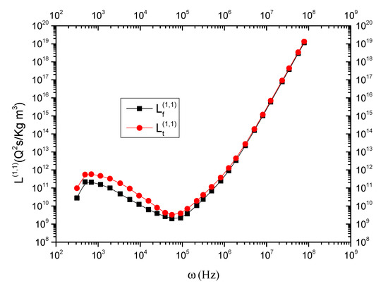 Comparison between normal (black line) and cancerous cells (red line) of displacement conductivity L(1,1)as a function of frequency, see Equation (A17).