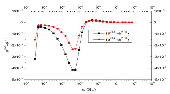 Comparison between the difference of state coefficients a(0,0) and a(1,1) in normal (black line) and cancerous cells (red line) as a function of frequency, see Equations (A15) and (A16).