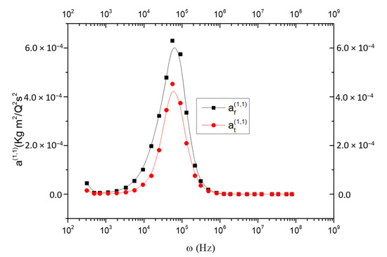Comparison between normal (black line) and cancerous cells (red line) state coefficients a(1,1) as a function of frequency, see Equation (A16).