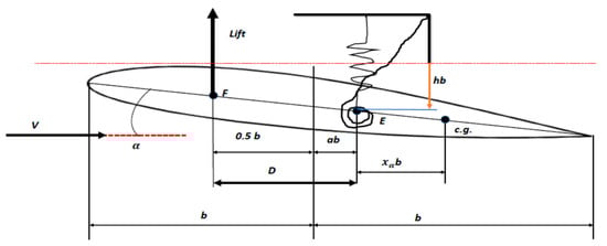 Figure 1 shows a schematic of an airfoil with the following parameters: µ = 20, a = −0.1, b = 1 m, xα = 0.25, = 0.5, = 0.2, = 28.1 Hz, and = 62.8 Hz, where , is the air density, m is the mass, b is the semichord point, ab is the distance of the elastic axis E from the midchord point, is the distance of E from the aerodynamic focus F, is the distance of the center of gravity from E, is the radius of gyration of the airfoil with respect to E, and and are the eigenfrequencies of the constrained two-degree-of-freedom system associated with the linear plunging and the pitching springs, respectively.