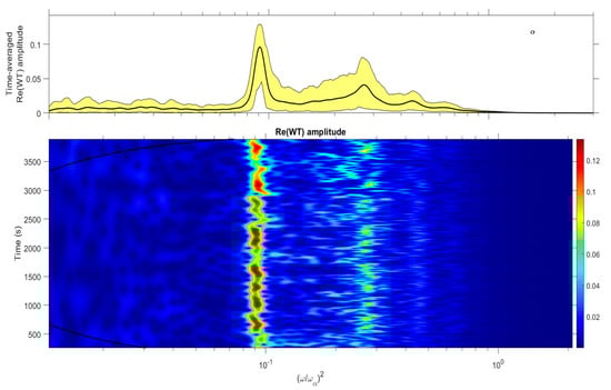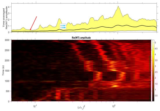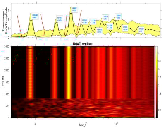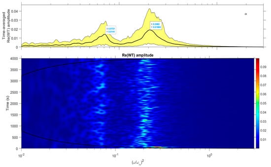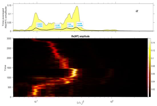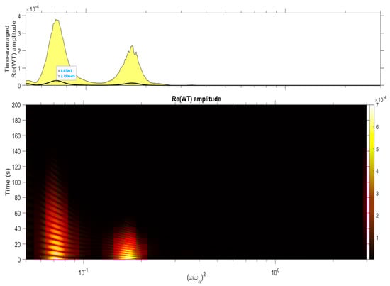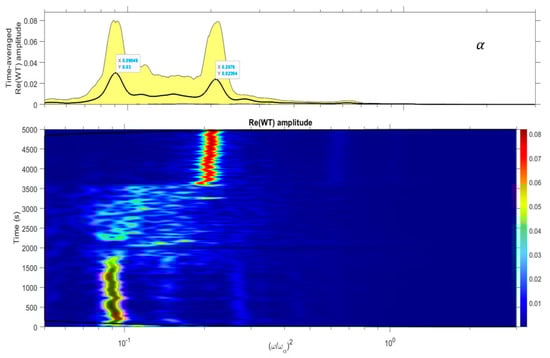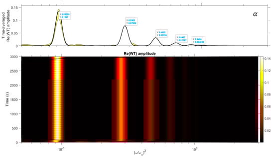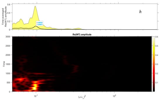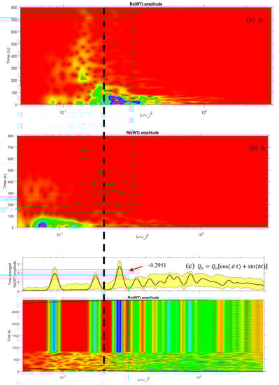 Next, an approximation is made where the damping ratio and frequency are approximately constant. This is not valid in the strictest sense for the Hilbert transformation when the signal is not periodic or infinitely long. However, this approximation allows the system damping to be estimated by taking the natural logarithm of Equation (9). It should be noted here that relevant spectral peaks will be tagged and different color schemes will be applied in the time–frequency maps to aid in the identification of relevant spectral features that are present after each calculation concludes. As a demonstration of the nonstationary signal processing method, the time–frequency analysis for the uncontrolled dynamics is presented in Figure 5 and Figure 6. For the pitch displacement, it is observed that the wavelet coefficient spectra are broadband, and decrease in magnitude with increasing frequency ratio. The strongest of these peaks is located at a frequency ratio of ~0.09259 (closest to parametric antiresonance frequency ratio of 0.0763). The remaining peaks are all in the vicinity of the known parametric resonant frequency ratios. The two strongest peaks are a parametric antiresonant mode (~0.09259) and a parametric resonant mode (~0.2803). The plunge displacement vibrates at the parametric antiresonant mode of ~0.09259.