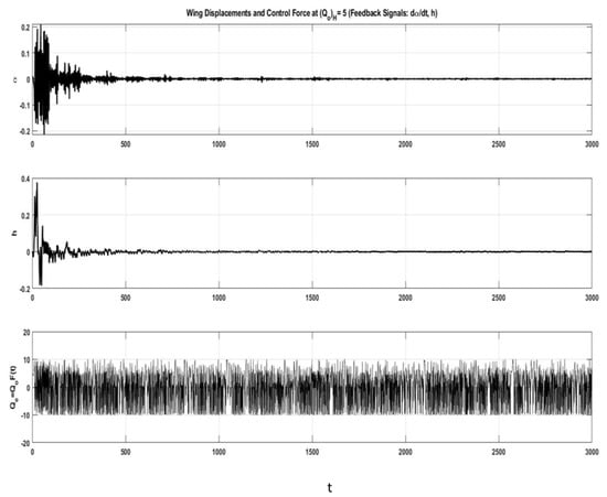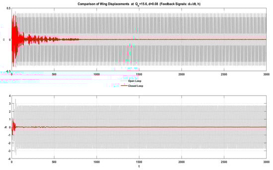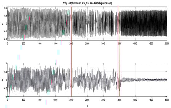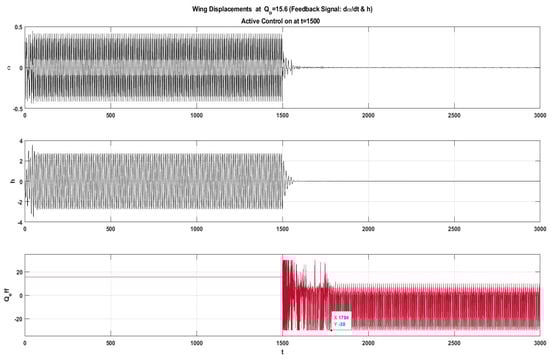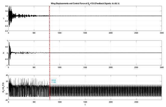 Figure 20 and Figure 21 show a comparison between the controlled and the uncontrolled dynamics at both operating conditions. The figures show that the prescribed control law is effective in suppressing the wing vibrations as compared to the uncontrolled dynamics. Figure 22 demonstrates that when the controller is switched on at t = 1500, the closed-loop system is successfully damped despite the fully developed dynamics in the chaotic regime.