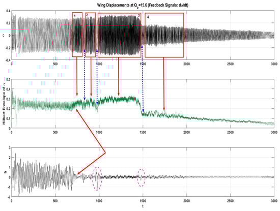 Figure 10 shows the aeroelastic response at .6. Included in this plot is the Hilbert envelope function of the pitch displacement signal. There are four resonance captures in the cascade, which are indicated by numbered rectangles with arrows pointing to specific time locations on the envelope function. The envelope function generally takes the shape of the time–frequency representation. The blue dashed arrows denote the system jump/bifurcations. From t = 0 to ~500, the wing vibrates at a frequency ratio of ~0.097. The system jumps to a frequency ratio of ~0.1659 (1), followed by a jump to ~0.2403 (2). The longest of the captures in the cascade begins at t = 1000 and terminates at t = 1500 exactly; this resonance capture occurs at a frequency ratio of ~0.3154 (3). The system then jumps down to ~0.2403 (4) and then transitions back to a frequency ratio of ~0.097; the amplitude of the pitch signal shows a decrease from t > 1500 (see Figure 10). The time–frequency analysis for the pitch displacement signal reveals that the resonance captures 2 and 3 have the most spectral energy. The time–frequency analysis for the bending displacement signal (Figure 11) shows that the spectral energy decreases significantly after t = 1000, indicating that nonlinear absorption has taken place. In the time domain, the amplitude of the bending displacement signal shows a reduction beginning at t ~ 753. When the wing jumps to a new resonance capture, the wing exhibits a pulse-like signature (indicated by the dashed ellipses—Figure 10). The prescribed perturbation signal causes the torsional displacement dynamics to behave like a nonlinear energy sink, and the corresponding mechanism of vibration suppression is the resonance capture cascade, as demonstrated in Figure 12. The resonance captures begin to appear when the airspeed parameter is set to a value of 9; the control perturbation signal inhibits the chaotic dynamics but does not suppress the limit cycle oscillation (LCO). In Case II, it will be demonstrated that the prescribed control perturbation signal induces the second type of resonance capture, namely the isolated resonance capture.