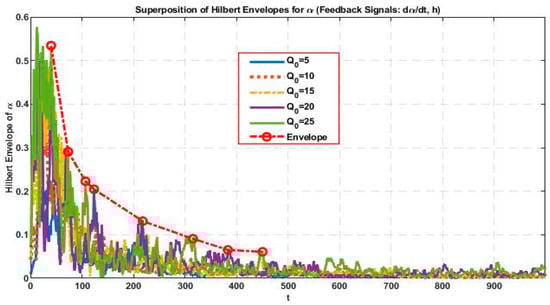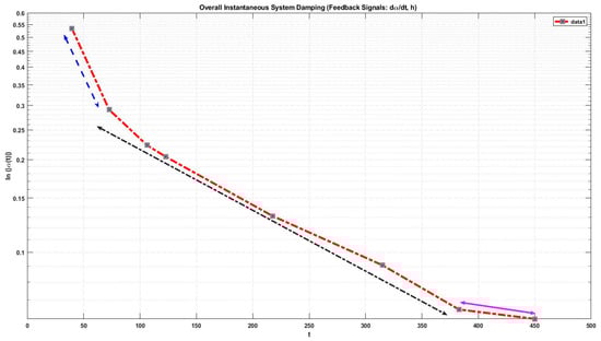 Figure 23 shows that the Hilbert envelope functions for each of the airspeed parameter settings are superimposed on one another. The envelope functions collectively show that the control action is able to damp the oscillations rapidly across a wide range of airspeed parameter settings including the Hopf bifurcation condition and in the post-flutter (chaotic) regime. The reader will note the dashed (red) curve enveloping the amplitude functions; this curve is used to obtain the instantaneous system damping (Figure 24). There are three distinct time intervals on this plot; the first interval is indicated by a blue double arrow, where the slope between t = 39.5 and 72.6 is high, indicating that the damping ratio is large. The damping ratio changes again (black dashed double arrow) at t = 72.6, where the damping ratio decreases as the controller dissipates the energy because the system now requires less damping. The system damping changes for the final time at t = 383, where the slope on this interval is shallow, so less damping is needed here as the pitch amplitude has fallen below 0.1. The damping between t = 383 and 450 is less than the previous two regions.