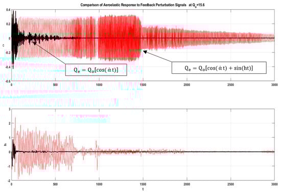 Figure 32a,b presents a comparison of the aeroelastic system PDFs under closed-loop control, with and without Gaussian random excitation. Under closed-loop control alone, the PDFs are unimodal with a sharp peak in both bending and torsion about their respective equilibrium positions. When the controlled system is perturbed by the Gaussian random excitation, the PDFs show that there is diffusion at the base of the PDFs and a shift in equilibrium position; this result suggests that excitation by noise alone is destabilizing under closed-loop control. The comparison time histories (Figure 33 and Figure 34) show aeroelastic displacements that have been destabilized and are transformed into random limit cycle oscillations. The signal to noise ratio (SNR) becomes negative for noise intensities as low as ~0.02. A time–frequency analysis (Figure 35 and Figure 36) shows that the excitation by noise amplifies a parametric antiresonance mode located at ~0.0721 and the parametric resonance mode located at ~0.2061. The proposed control scheme is susceptible to noise; one possible way to mitigate the destabilizing effect of noise on the closed-loop system is to apply a least-mean-square (LMS) adaptive filter to the feedback signals before they are passed to the control law itself. Further numerical experimentation is needed to tune the LMS filter parameters and generate parameter maps to accommodate the changes in the vehicle operating point, after which a re-assessment of the robustness of the proposed control scheme is required with the adaptive filter in place.