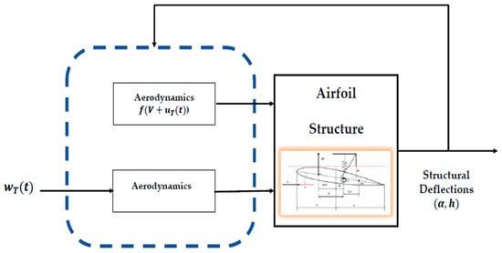 Aircraft in general (and, in particular, high-performance aircraft) experience nonlinear aeroelastic phenomena inside their published operational flight envelopes due to excitation by turbulence [21,22]; this can become a significant airworthiness issue if not accounted for in the design, development, and certification of the aerospace structure itself and the resulting aeroelastic control laws. The purpose of this section is to briefly examine the effects of random excitation (simulated turbulence) on the uncontrolled and closed-loop aeroelastic system. Liu et al. [23,24,25] present work on a 2D airfoil with cubic nonlinearities in both bending and torsion; one of the works has the wing under sliding mode control. The general objective of these works was to examine the effects of combined harmonic and random excitation at various noise intensities on the aeroelastic response of the airfoil. However, only the pitch degree of freedom was subject to excitation. From a practical standpoint, turbulence is felt by the airfoil as external forcing and a parametric excitation. Specifically, for a typical section, the oncoming freestream velocity vector that interacts with the airfoil is augmented by longitudinal and vertical turbulence (Figure 26).