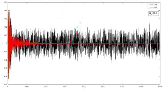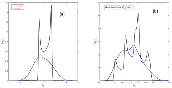 Figure 28a,b show the comparison between the amplitude-based probability density functions (PDFs) for the unforced and the noise-excited dynamics of the aeroelastic displacements. In Figure 28a, the unforced system exhibits a bimodal PDF in bending and four distinct displacement modes in pitch (Figure 28b). The multiple peaks seen in Figure 28b indicate that the system is strongly phase-coherent. When the system is excited by the noise (), it is observed that the random excitation suppresses the phase coherence (also referred to as coherent oscillation [26]); this is indicated by the single peak seen in the bending PDF and the double hump seen in the pitch PDF. The signal-to-noise ratio (SNR) becomes less than zero for noise intensities between 0.4 and 0.5.