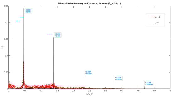 In Figure 29, a comparison of the frequency spectra is presented for the pitch displacement. It can be observed that the excitation by noise alone results in the attenuation of higher modes (namely ~0.4657, ~0.6522, and 0.8385). Only the parametric antiresonance mode (~0.09325) and a parametric resonance mode located at ~0.2795 remain. A similar result is discussed by Ditzinger and his colleagues [26]; they have observed that random excitation alone (an uncorrelated Wiener process) caused the attenuation of frequency peaks seen in the spectra of a Langevin system, and significant reduction in the height of the main spectral peak. A time–frequency analysis of the aeroelastic displacements (Figure 30 and Figure 31) show that the parametric antiresonance mode generally holds most of the energy while the parametric resonance mode has weak intermittent periodicity. In addition, the wavelet coefficient magnitude is higher in the linear bending dynamics at the parametric antiresonance mode (~0.09325) than in pitch due to mechanical coupling, which results in an energy exchange between the two displacements (Figure 31). For the unforced case, the results show that the excitation by noise suppresses the phase coherence. The unforced condition is a post-flutter regime and it is a condition that compromises the structural integrity of the primary flight structure; excitation by turbulence in this instance is beneficial to the wing structure (in its current aeroelastic configuration) as it suppresses the chaotic response.