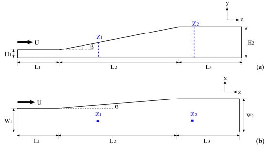 To validate the suitability of the model for the present simulation, a comparison is made between experimental results reported by Schneider et al. [32] and numerical outputs of the present study obtained within a 3D diffuser. The schema of the diffuser and its dimensions are presented in Figure 2 and Table 3, respectively. In the experiments, the centrifugal pump (Little Giant model No. TE-6MD-HC) is used to transport the water with a constant flow rate of 20.3 L/min. The average volume flow rate is recorded using a Signet Scientific MK315.P90 paddle wheel flow meter with an accuracy of 5% FS. The velocity data was obtained using the method of magnetic resonance velocimetry (MRV). The time-averaged streamwise velocity and vertical velocity are measured at two streamwise locations at the centerplane x/W = 0.5 (see Figure 2). Figure 3(a1,a2) show the distribution of the time-averaged streamwise velocity and vertical velocity along the centerplane at location = 5, respectively. The streamwise velocity profiles of the present study show that the LES model seems to underpredict the velocity in zones close to the lower wall. This means that more efforts should be devoted to model this region, trying to use other SGS models or refine the mesh. Even though there are some differences near the bottom of the diffuser, the overall profiles matched well with that obtained from Schneider et al. [32] experiments. Figure 3(b1,b2) exhibit the same velocity profiles at location = 16. It can be observed that the numerical models tested allow a faithful reproduction of the characteristic curves at the measured location.