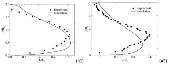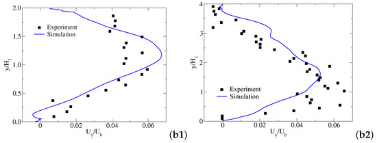 Time-averaged streamwise velocity —(a1,a2) and time-averaged vertical velocity —(b1,b2) profiles along at -(1) and -(2). = 1 m/s, = 0.01 m. Experimental data are taken from [32,33].