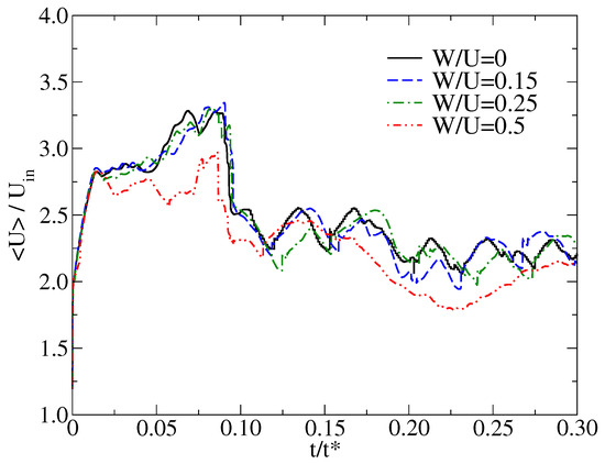 In the transient simulations, a criterion is required to evaluate the flow sate. For this purpose, we monitored the development of volume-averaged dimensionless velocity, , with the dimensionless simulation time, , under different inlet swirling ratios and found a noticeable narrow peak in the profile within = 0.08 (see Figure 5). The observed peak corresponds to the initial start-up period. After an initial start-up period, the simulations reach steady state operation. Within the steady state operation, the small velocity fluctuations can be observed from the profile. Thus, only the results of last = 0.22 were used for the analysis of the time-averaged flow field. As the swirling ratio increases from 0 to 0.5, the magnitude of the changes in the is significantly small. This indicates that the change in the swirl ratio from W/U = 0 to 0.5 has no large impact on the volume-averaged flow velocity.