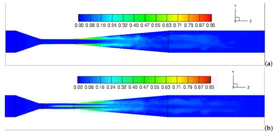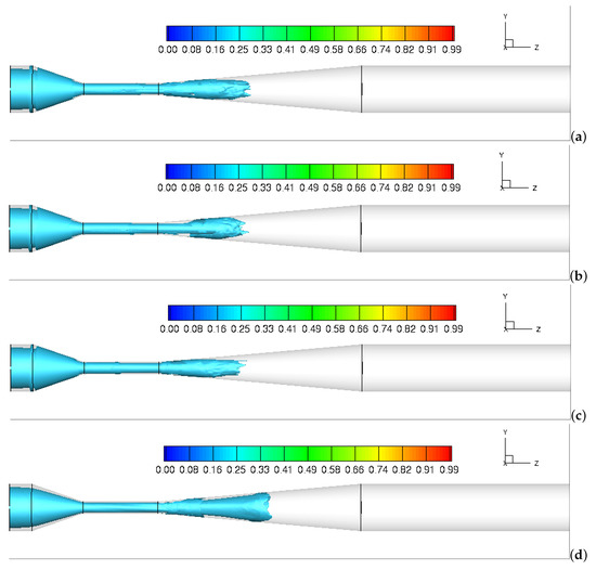 To explore the influence of inlet swirl ratios on the mixing behavior of two miscible fluids, Figure 8 shows the contour plots of the time- and volume-averaged Component-2, , in the center plane of the domain. As can be seen from the figures, Component-2 is fed into the outer annulus of the Venturi and penetrates the Component-1 along the Venturi walls. The mixing of two components in the downstream throat section is apparent, as is the decay of Component-2 along the axis. Small differences between patterns are observed at three different inlet swirl ratios from W/U = 0 to 0.25 (Figure 8a–c). However, as the inlet swirl ratio is further increased to W/U = 0.5, an intensive mixing between two components occurs in the full divergent section (Figure 8d). The introduction of high swirl ratio produces a continuous centrifuge, and thus the intensive mixing occurs due to the high tangential velocity gradient in the downstream throat region. Figure 9 depicts the iso-surface contours of the time- and volume-averaged Component-2, , under different swirl ratios. The Component regions are depicted as the iso-surfaces where the reaches 0.2. As it is depicted in the figure, the components (/) mixing zone extends towards the downstream as the swirl ratio increases from 0 to 0.5. This indicates that the high concentration of decreases to a low concentration as the mixing between two fluids is promoted by increasing device inlet swirl.