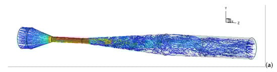 The streamlines of the mean z-axial velocities across the cavitating Venturi tube are plotted in Figure 12. When entering the Venturi tube, the magnitudes of the flow velocity are comparable for all cases. In particular, a higher velocity is present in the construction zone with a minimum cross-sectional area. From the figure, the introduction of the swirl is shown to produce an apparent radial expansion of the flow in the upstream and throat sections of the Venturi tube. The swirling flow decays along the length of the device towards the outlet.