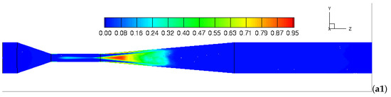 To study the effect of the fluid viscosity on the cavitating behaviors, Figure 13(a1,b1) present the time- and volume- averaged vapor volume fraction and static pressure at two different fluid viscosity ratios of and . It can be observed that the intense cavitating region moves from the downstream to the center of the throat section as the fluid viscosity ratio decreases from to . The results generally imply that the cavitating behaviors is largely influenced by the fluid viscosity. This phenomenon can be explained by the contours of the static pressure as shown in Figure 13(a2,b2). From the figures, we found a similar distribution of the pressure pattern for two cases. A lower pressure magnitude (2338–50,000 Pa) is present in the throat section and the beginning of the divergent section, while a higher pressure magnitude (310,000–360,000 Pa) is distributed in the upstream. As we compare the static pressure in the throat section, we found that the pressure magnitude for is slightly higher in the throat section than that for . This means that the high viscous flow reduces the local flow velocity and consequently increases the local pressure owing to Bernoulli’s principle. As a result, the cavitating behavior is less intense for high viscous flow in the throat of the Venturi tube.