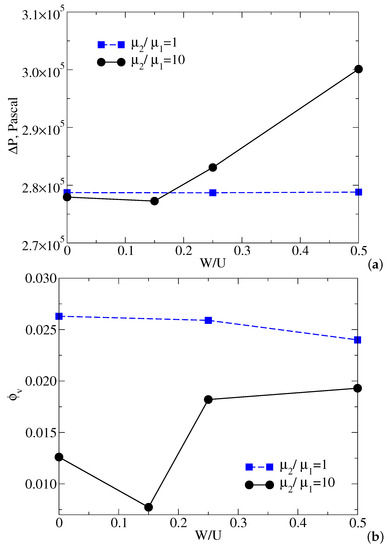 To assess the influence of the swirl ratios on the flow characteristics and the generation of cavitation, Figure 14 depicts the relationship between the static pressure drop, , vapor volume fraction, , and the swirl ratio, . From the profiles, we noted that while a lower tangential velocity (W/U = 0.15) is imposed in the inlet, the static pressure drop remains almost constant, but the vapor volume fraction decreases significantly from 0.0126 to 0.008. As the swirl ratio further increases from W/U = 0.15 to 0.5, the static pressure drop increases linearly from 277,253 to 300,112 Pa, while the vapor volume fraction rises nonlinearly from 0.008 to 0.019. This is expected since the pressure drop required is greater when an intense swirl is introduced. Compared with the two miscible flow (), a lower pressure drop and a higher vapor production of the pure water flow () can be observed as the swirl ratio increases from 0 to 0.5. The phenomenon is expected since the cavitation process only occur in pure water rather than in Component-2. In addition, the changes in the pressure drop and vapor volume fraction is significantly small of the pure water flow. This may be explained based on the fact that the high-viscosity fluids () results in increased resistance to the flow motion, so the pressure drop is significant. The negligible pressure drop indicates that there is almost no additional power loss and the constant pumping efficiency with the increases in swirl ratio for pure water.