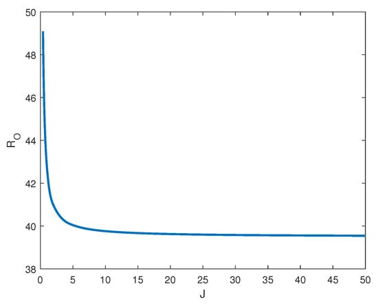 Let us fix and let J vary in order to analyze the behaviour of with respect to J. In this case, one has that and there exists a threshold for the inertia coefficient, such that exists and convection arises via an oscillatory state (see Table 1). Furthermore, is a decreasing function of J (see Figure 1).