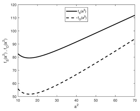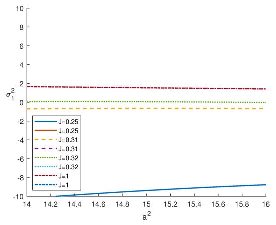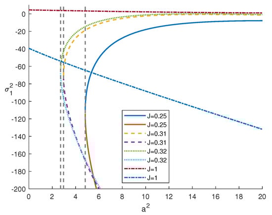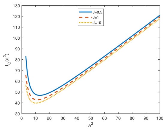 In Figure 2 and Figure 3, we plot the frequency of oscillation motions (solution of (37)) with respect to for different values of J: the graphs show that the existence of (>0) and, hence, of is guaranteed for .
